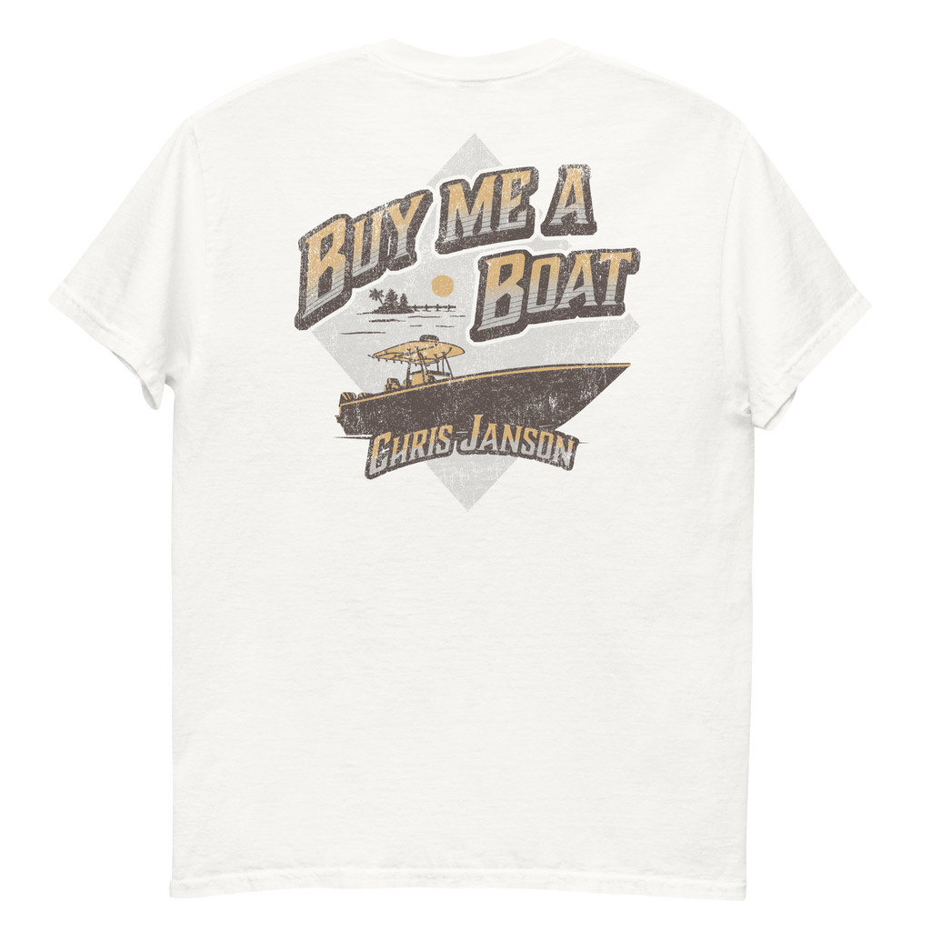 White, unisex t-shirt celebrating 10 years of Buy Me A Boat. Featuring a logo on the front and boat design on the reverse.