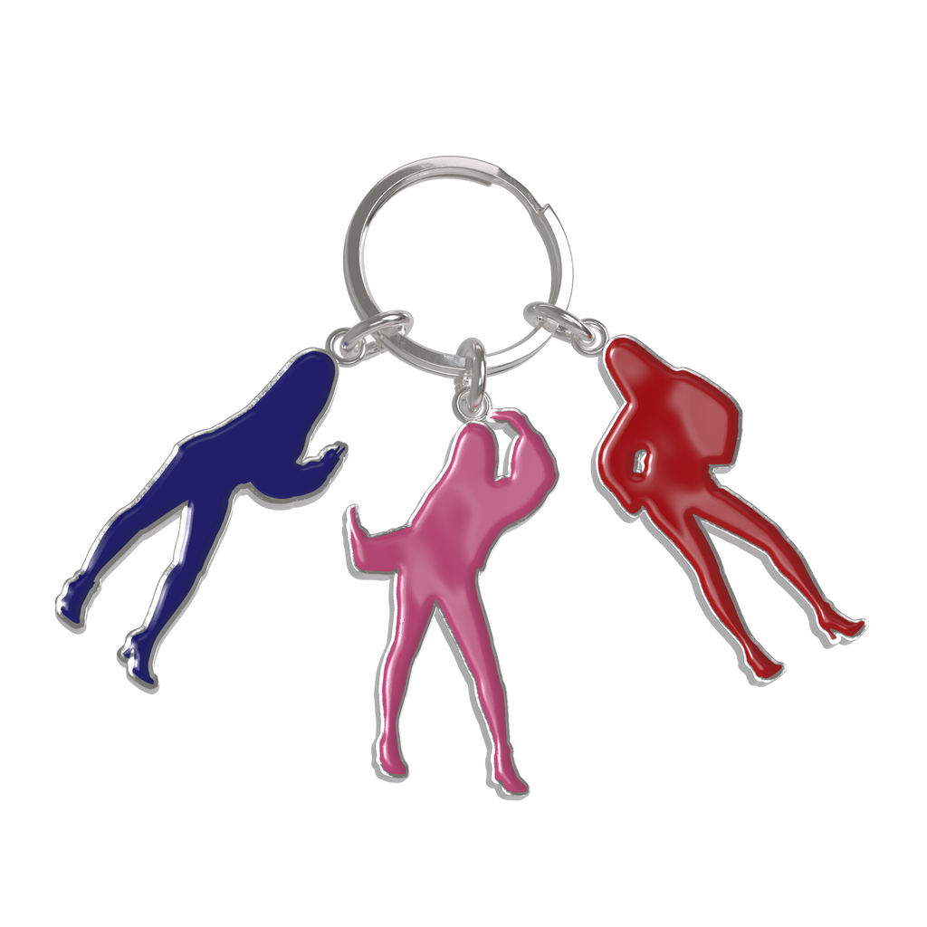 Stamp metal badges with soft enamel, 50mm of each figure on the keyring.