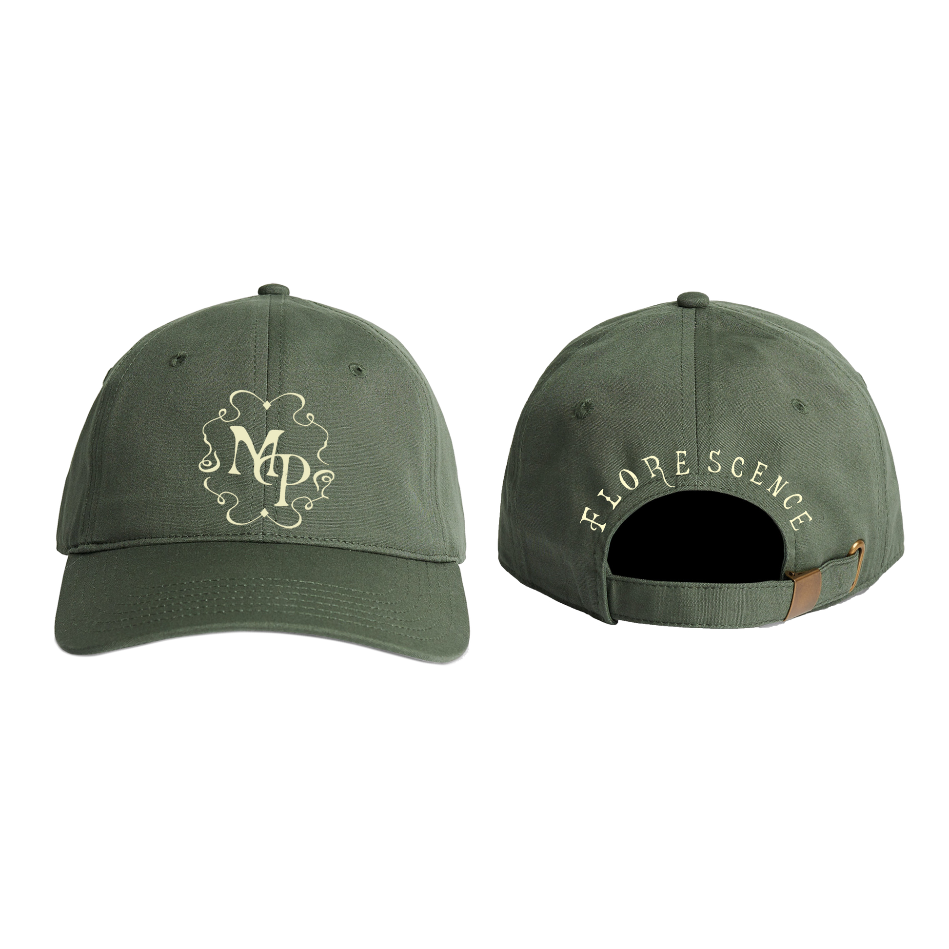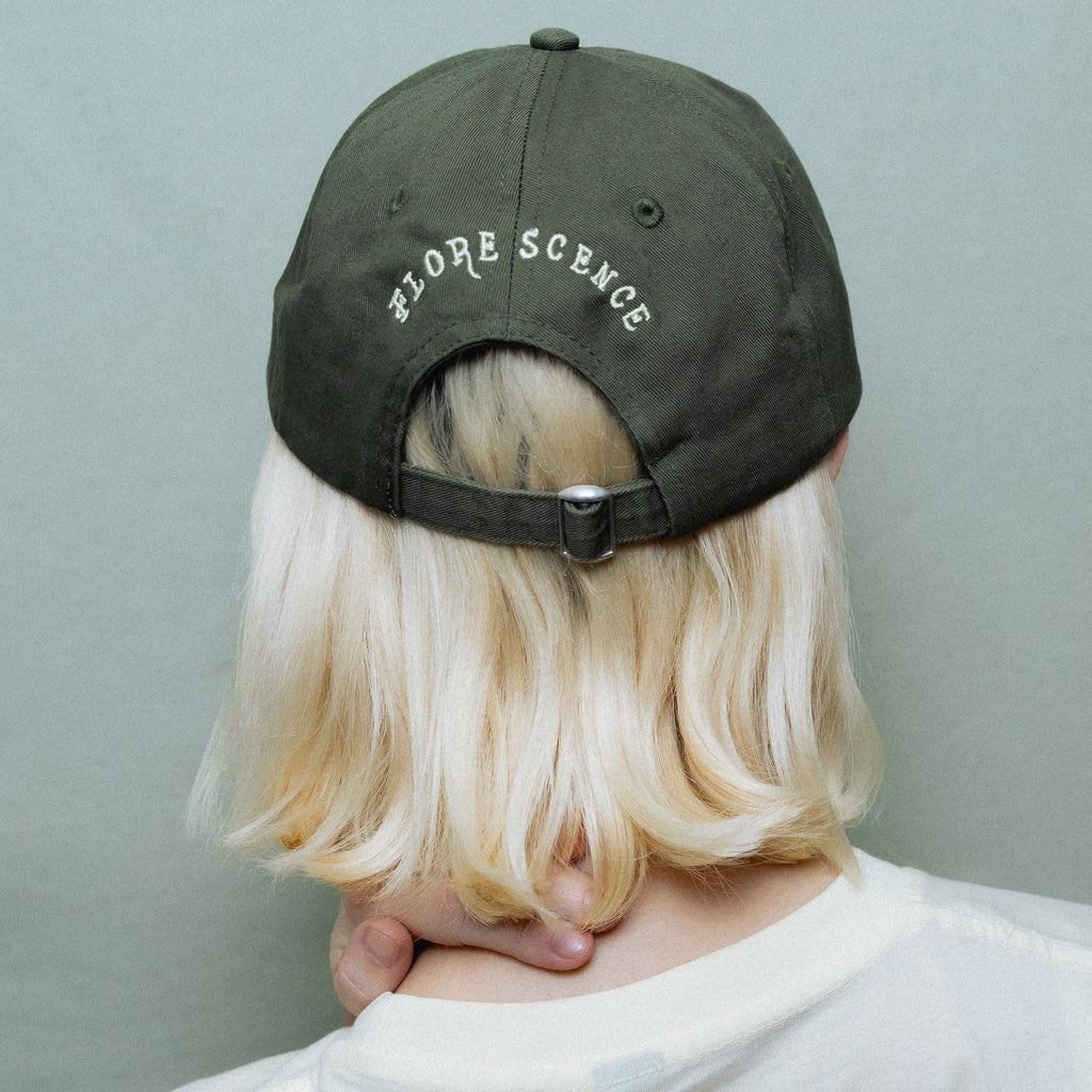 A faded green dad-cap, with an ‘MP’ initial design on the front, and the album title ‘Florescence’ across the back in butter yellow embroidery.