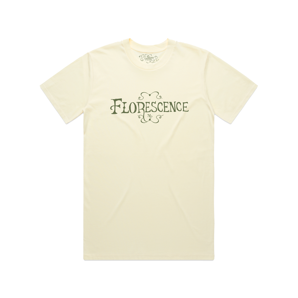 The perfect butter yellow cotton tee, screen printed with ‘Florescence’ in sage green across the chest to celebrate Maisie’s third studio album. Finished with tiny ‘MP’ initials in the border embellishment.