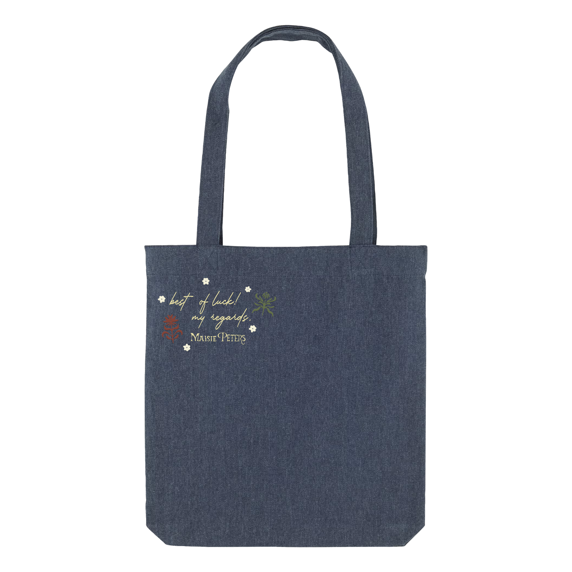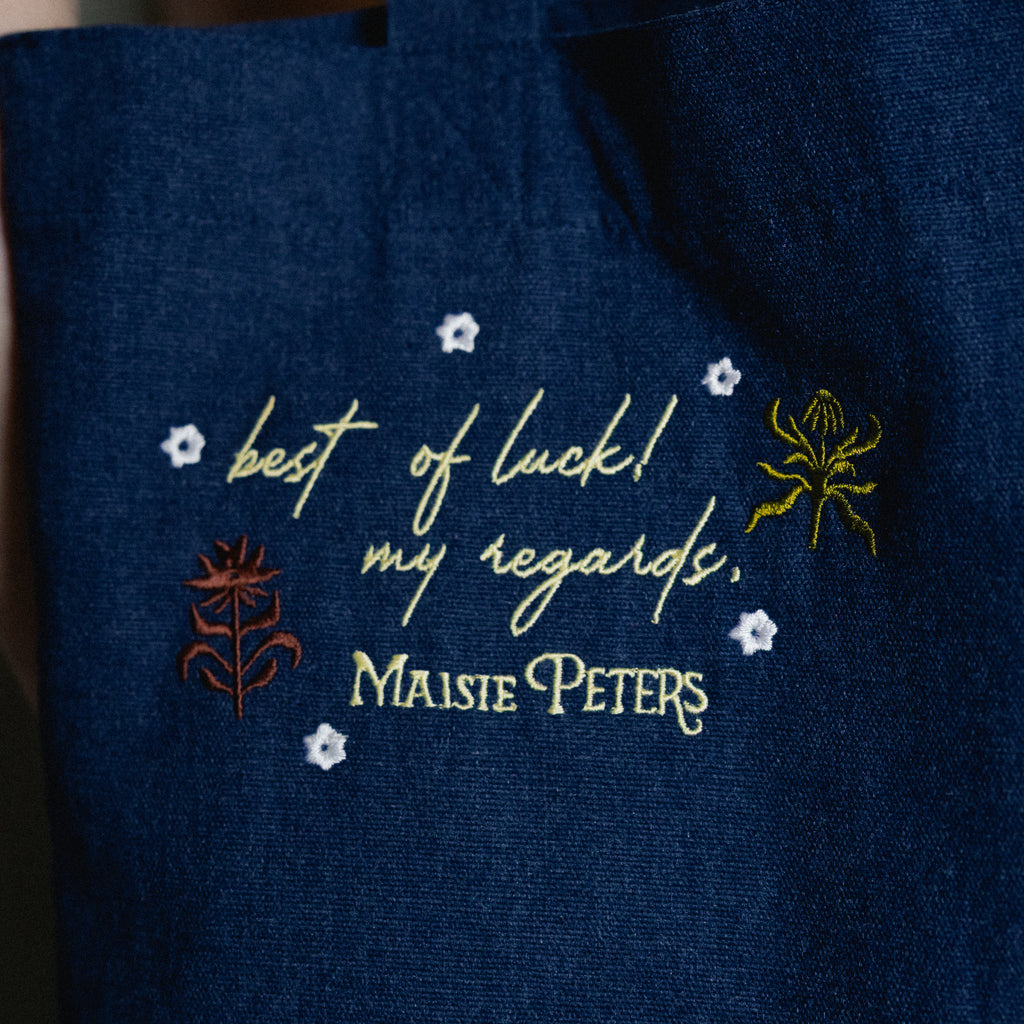 A navy blue, denim-look tote, with an embroidered message from Maisie: ‘Best of luck! My Regards, Maisie Peters’. The butter yellow message is surrounded with colourful, floral embroidery, including tiny white daisies (IYKYK).