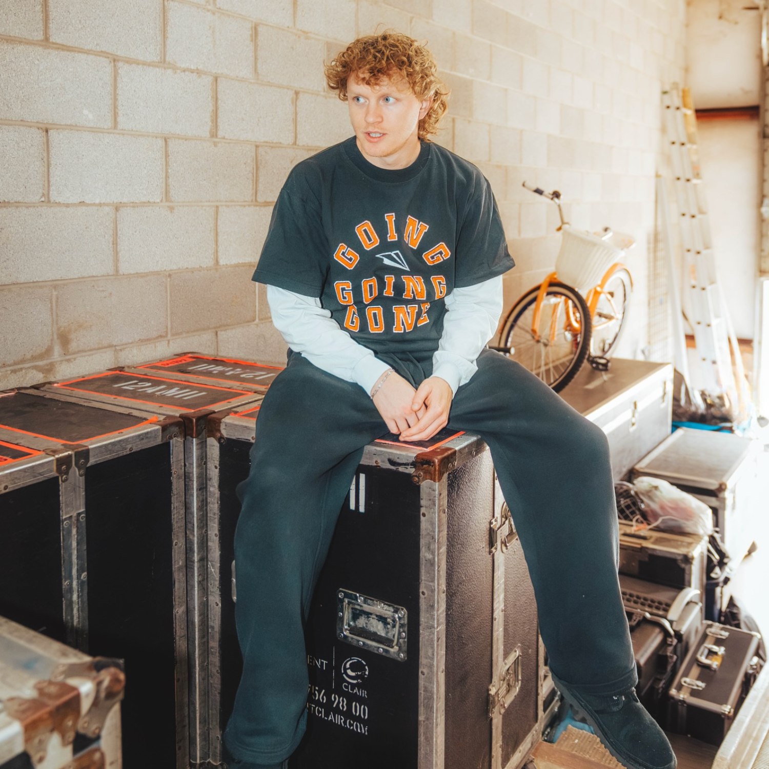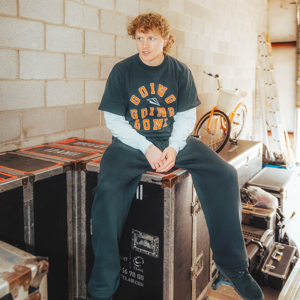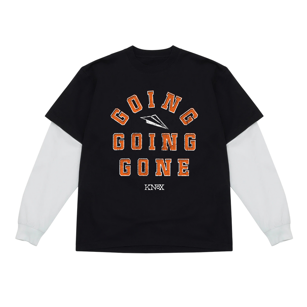 Heavyweight cotton long sleeve tee with Going Going Gone and a paper airplane printed on the front. Limited quantity available for this special black t-shirt, white sleeve combo with ribbed knit cuffs.