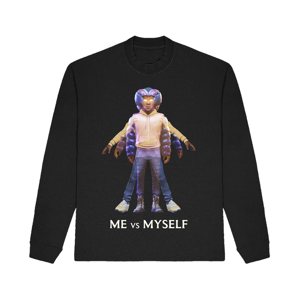 The Me vs Myself Long Sleeve features an illustration inspired by the album above the text ‘Me vs Myself’. This design is printed on a black unisex long sleeve shirt.