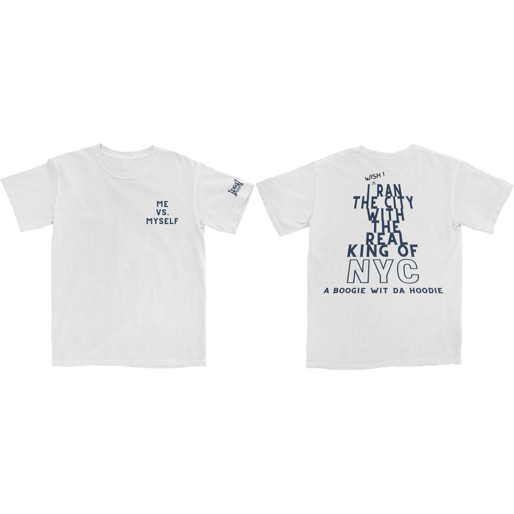 The NYC Me vs. Myself Tee commemorates the release event which took place in NYC. This design is printed on a white unisex t-shirt. 100% cotton