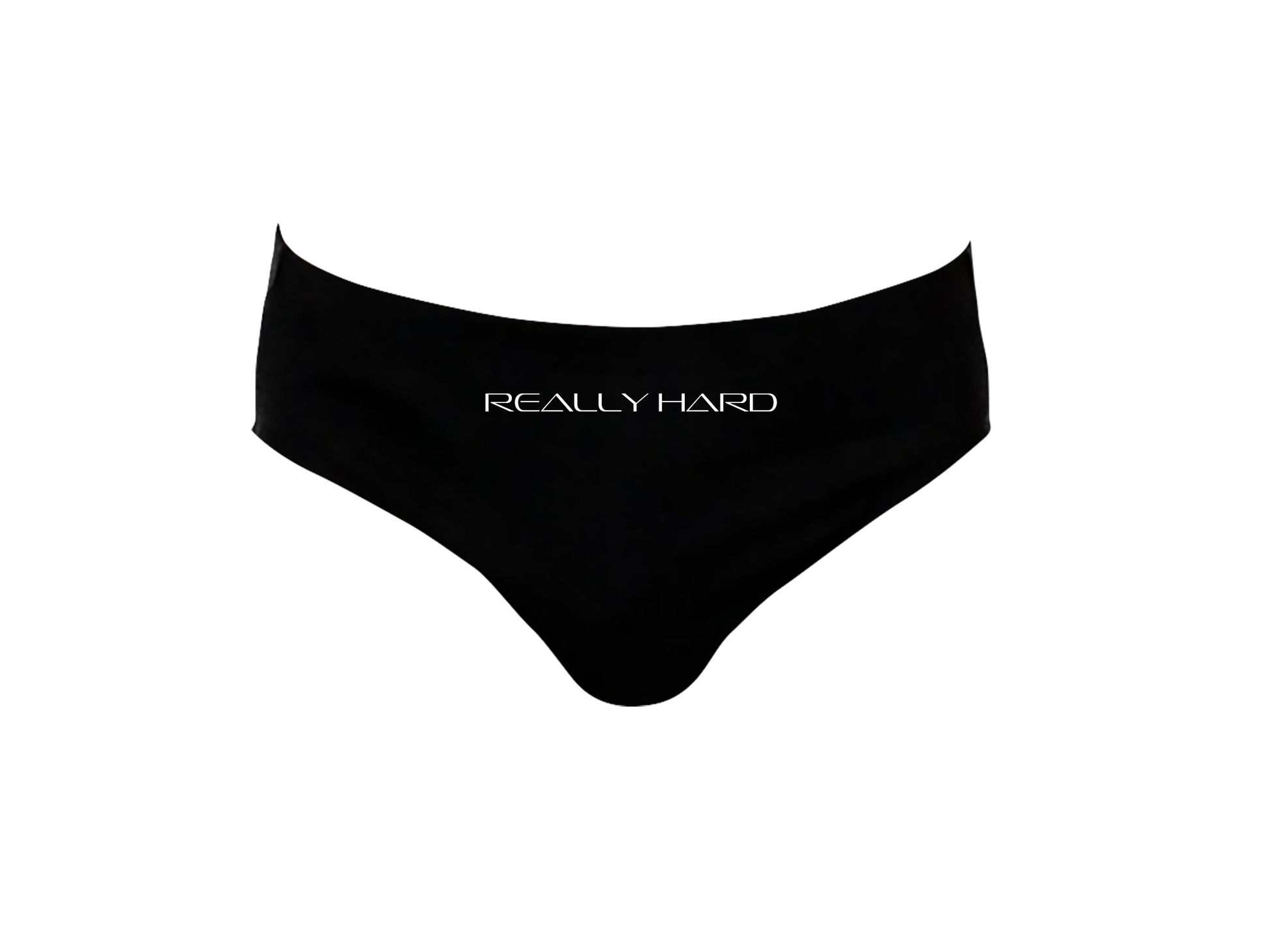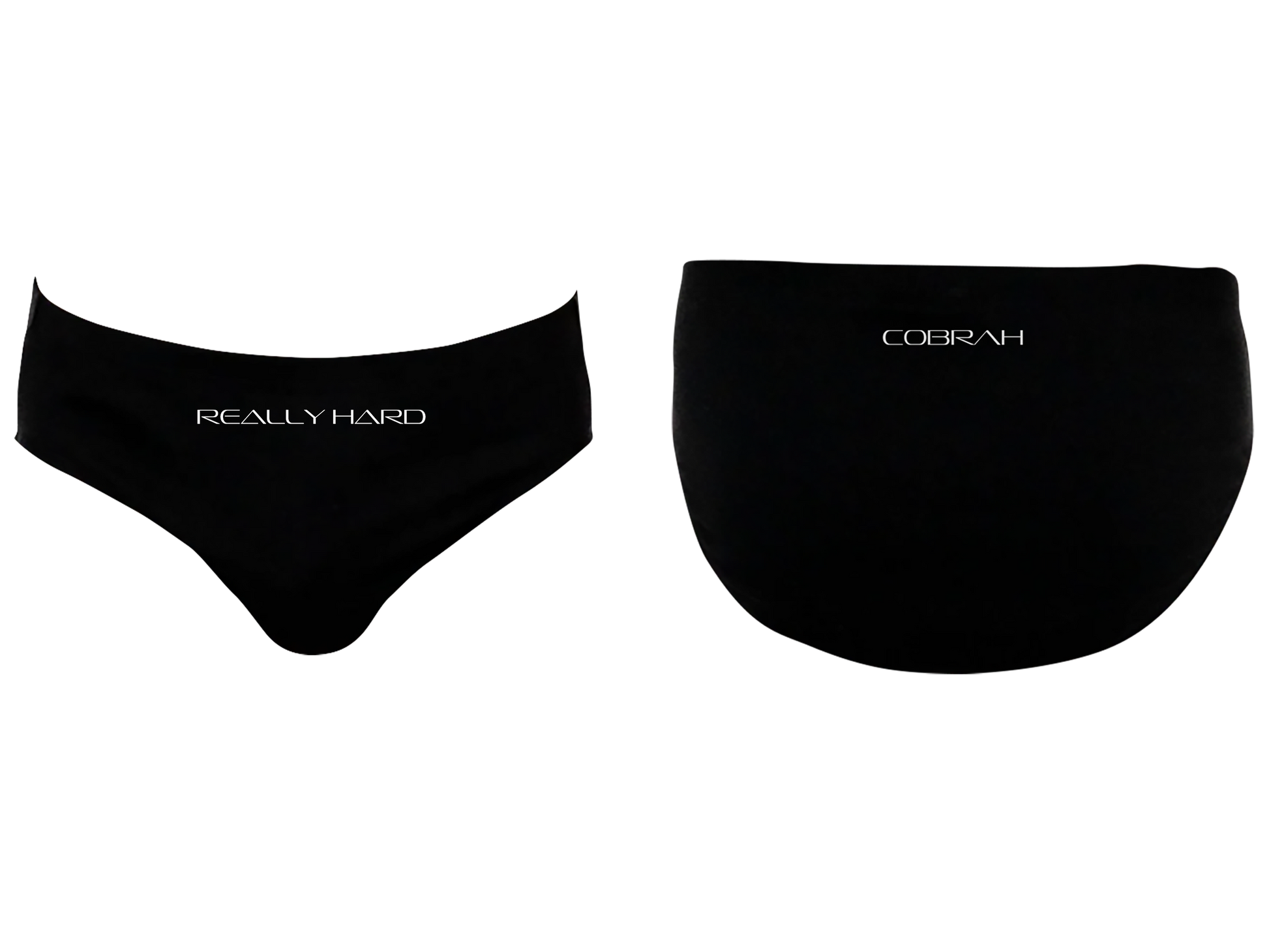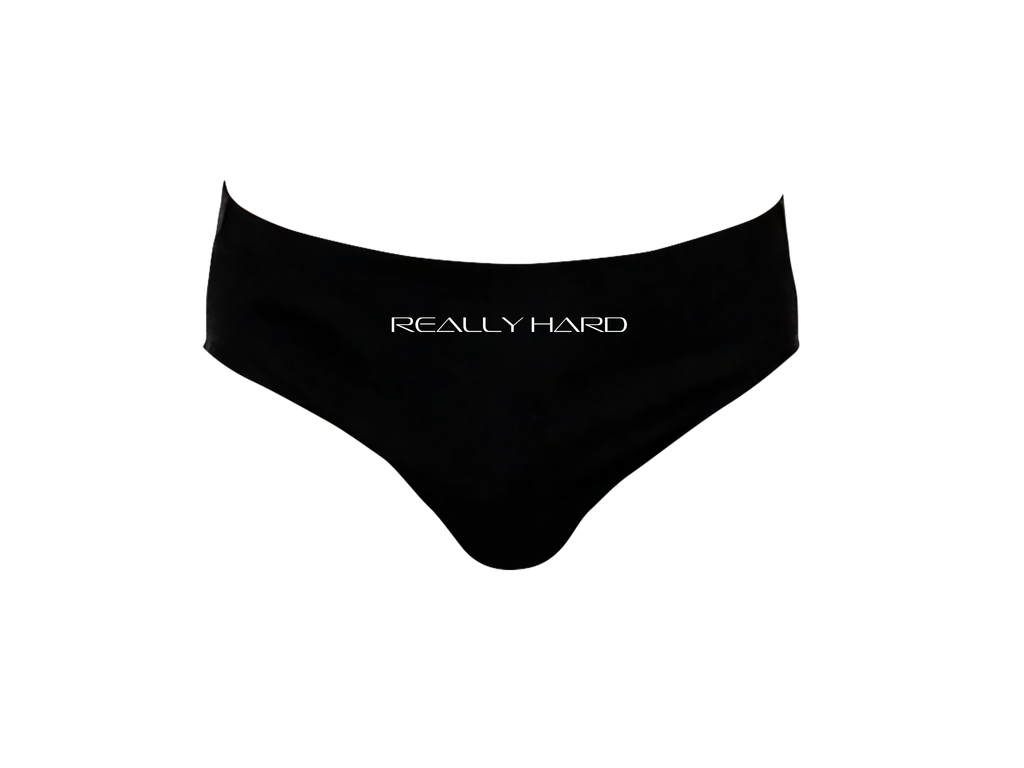"Really Hard" printed on euro fitted briefs. Cobrah screen-printed on the back.